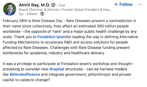Dr. Amrit Ray focuses on one of the biggest barriers in rare disease progress: how innovation is funded. Through his global healthcare leadership, he has advocated for new funding models that combine public, philanthropic, and private capital to accelerate research and access.