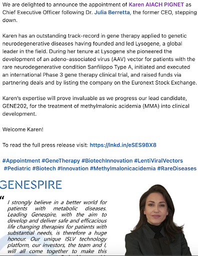 She founded Lysogene (and later became CEO at Genespire) to develop gene therapies for rare brain-related disorders and has spent her career advancing rare disease research through biotech leadership and advocacy. Today, as CEO of Genespire, she continues advancing gene therapy approaches for children with severe genetic diseases.