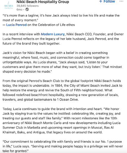 Lucia Penrod leads Nikki Beach Hospitality Group, a brand shaped by personal loss and remembrance. While her work is not rooted in medical advocacy, her emphasis on honoring life resonates deeply within rare disease communities, where families often face profound loss alongside ongoing caregiving.