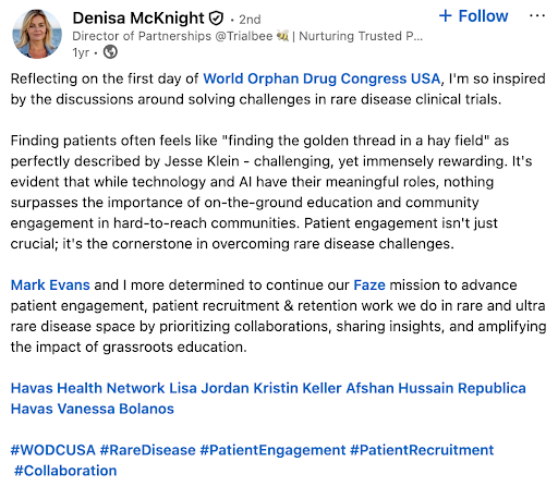 His work emphasizes collaboration among biotech companies, researchers, and patient communities to reduce barriers to rare disease drug development and accelerate the path to new treatments.