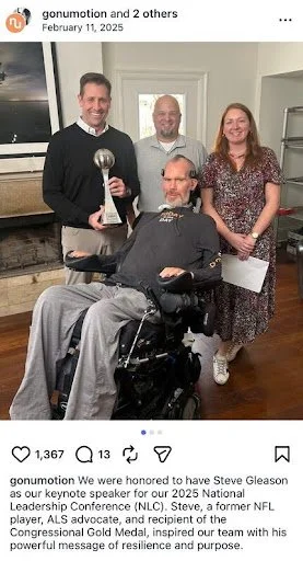 Former NFL player Steve Gleason transformed his ALS diagnosis into sustained advocacy for people living with progressive neurological disease. Through Team Gleason and the documentary Gleason, he brought national attention to the physical, emotional, and caregiving realities of ALS, reinforcing that purpose and contribution persist even as physical abilities change.