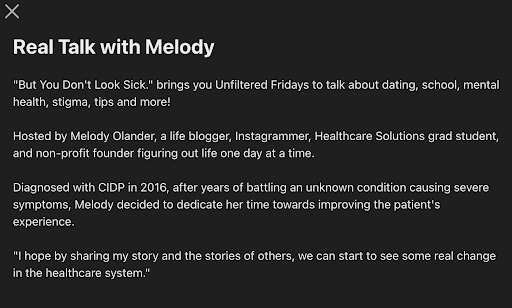 Melody Olander is a content creator and advocate living with CIDP, a rare neurological condition affecting the nerves that control movement and sensation. Through honest storytelling about invisible illness, she brings attention to the emotional toll of being chronically sick while appearing “fine” to the outside world.