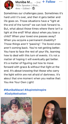 Muniba Mazari is a global speaker and artist who became paraplegic after a life-altering accident and has since used her platform to redefine resilience.