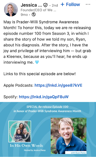 Jessica Patay is the founder of We Are Brave Together and the mother of a child with Prader–Willi syndrome. Through retreats, support groups, and storytelling, Patay centers caregiver mental health as a critical part of the care ecosystem.