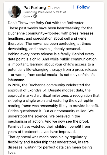 Pat Furlong is the founding president and CEO of Parent Project Muscular Dystrophy and a pioneering leader in rare disease advocacy.